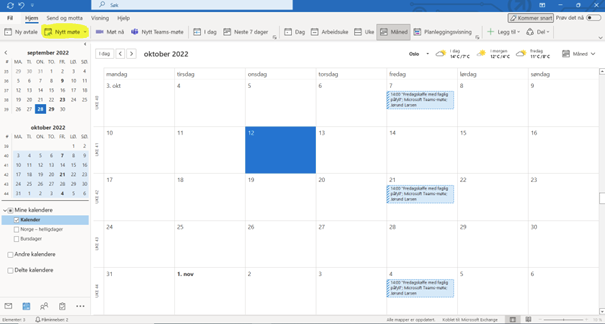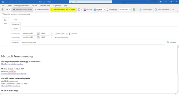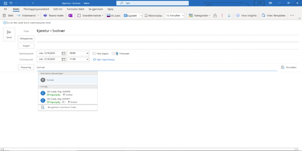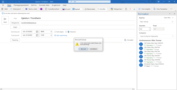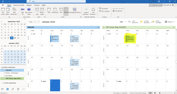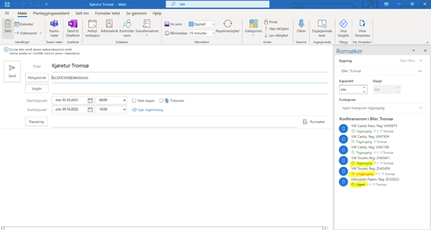 NB! Ikke gjør noen direkte reservasjoner av biler direkte fra kalenderen til bilen, selv om du har gjort den tilgjengelig direkte fra din Outlook. Dette vil forstyrre systemet, og kan skape problemer for andre som ønsker å booke. Bestandig book bil fra din egen kalender.