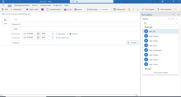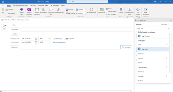 Alle biler tilknyttet Åkerblå skal nå være mulig å booke gjennom Outlook. Bilene er knyttet geografisk opp imot byer/lokasjon, og bookingen gjøres enklest gjennom funksjonen Romsøker i Outlook.