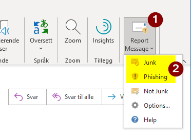 For å rapportere mistenkelige meldinger i Outlook bruker du (1)"Report Message"-knappen oppe til høyre.