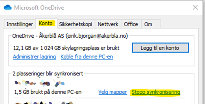2. Trykk på fanen «Konto», og deretter på «Stopp synkronisering» på det området du ikke lengre skal synkronisere.