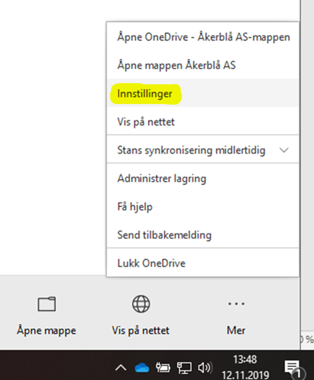 1. Høyreklikk på (blå skya) nede til høyre og trykk på innstillinger: